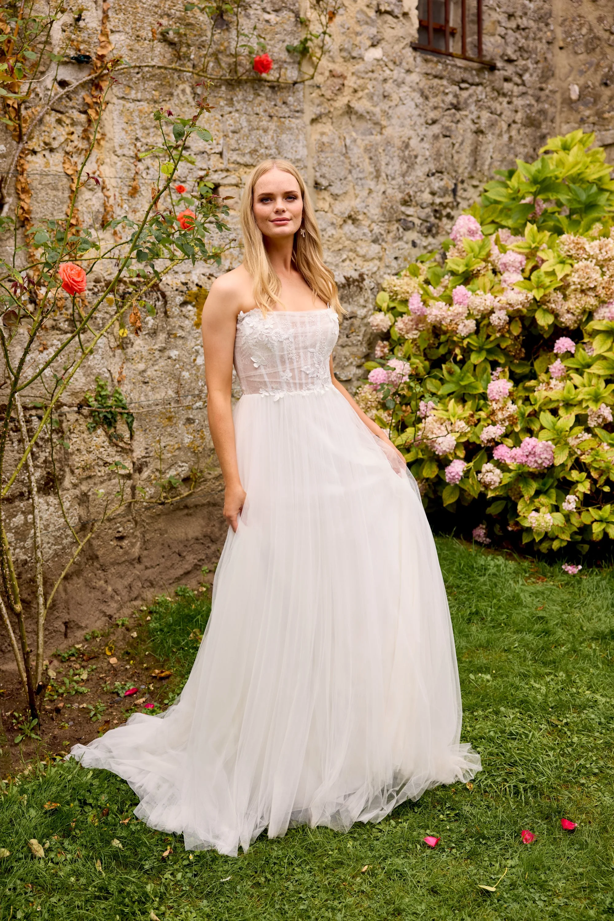 Vestido de tul inglés de corte A con escote recto estilizado. El corpiño presenta apliques de encaje con cuentas y lentejuelas, lentejuelas plateadas y cuentas de rocalla tonales, y flores cortadas a láser en 3D.