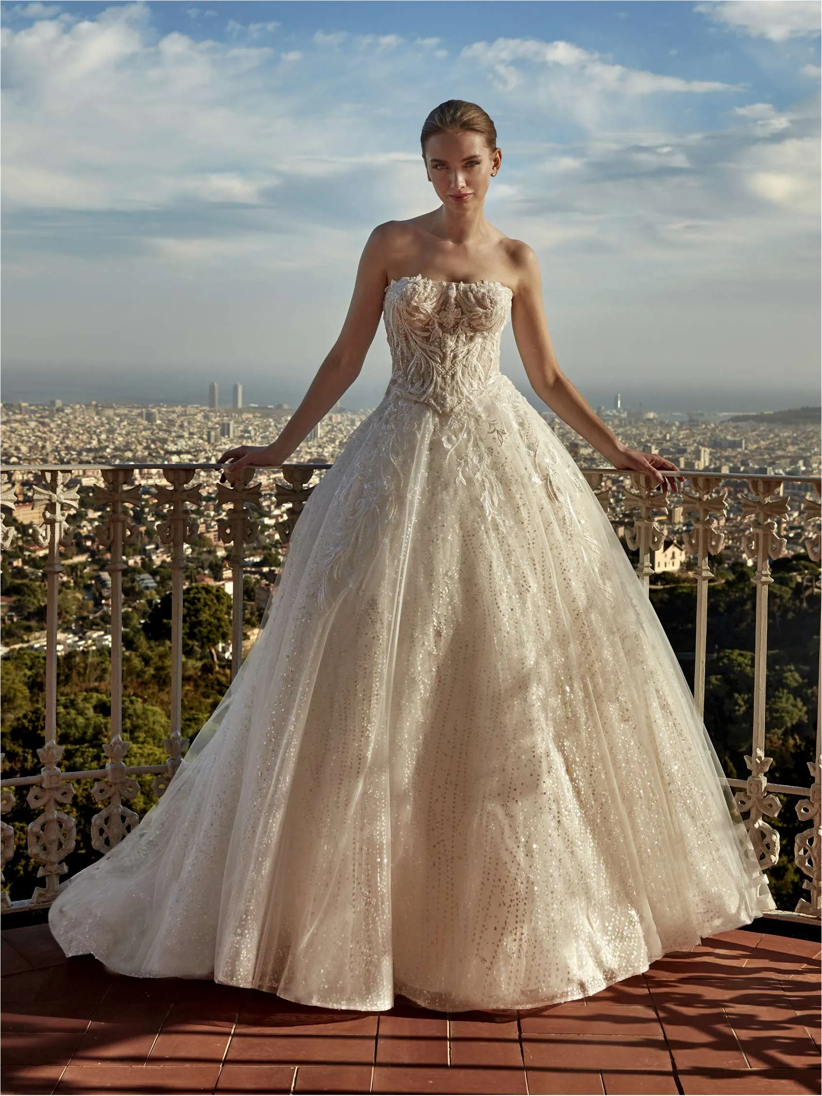 Un vestido de tul con brillo, encaje y cuentas que evoca fantasía. Su corte princesa y escote palabra de honor crean una imagen inolvidable.