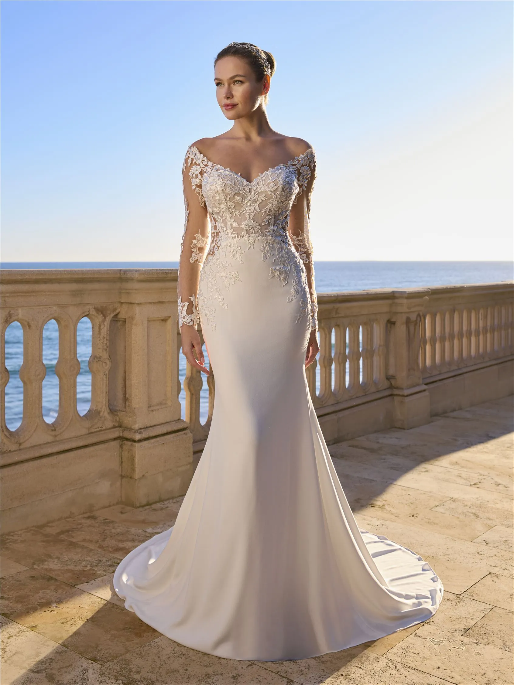 Un diseño elegante con un sensual corte sirena, escote de hombros descubiertos y mangas alargadas. Confeccionado en crepé, tul, encaje y cuentas, este vestido derrocha una elegancia sublime, ideal para una novia con gusto sofisticado.