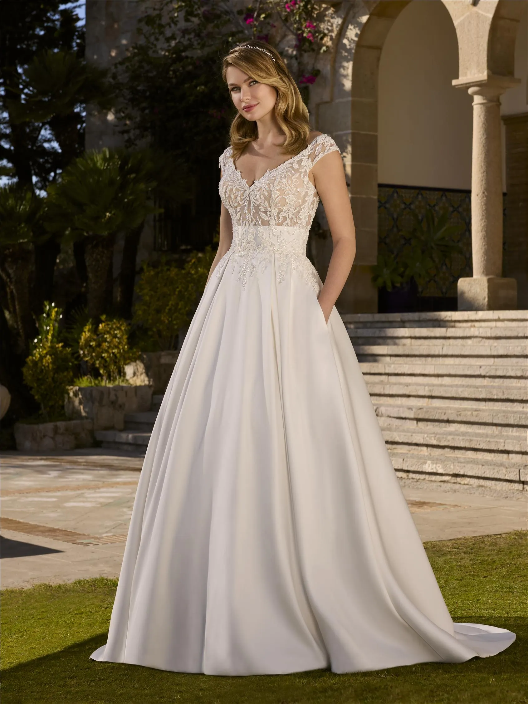 Un lujoso vestido de princesa con escote pronunciado, confeccionado en suave mikado, capas de tul, delicado encaje y exquisitas cuentas. Una elección impecable para una boda regia y contemporánea.