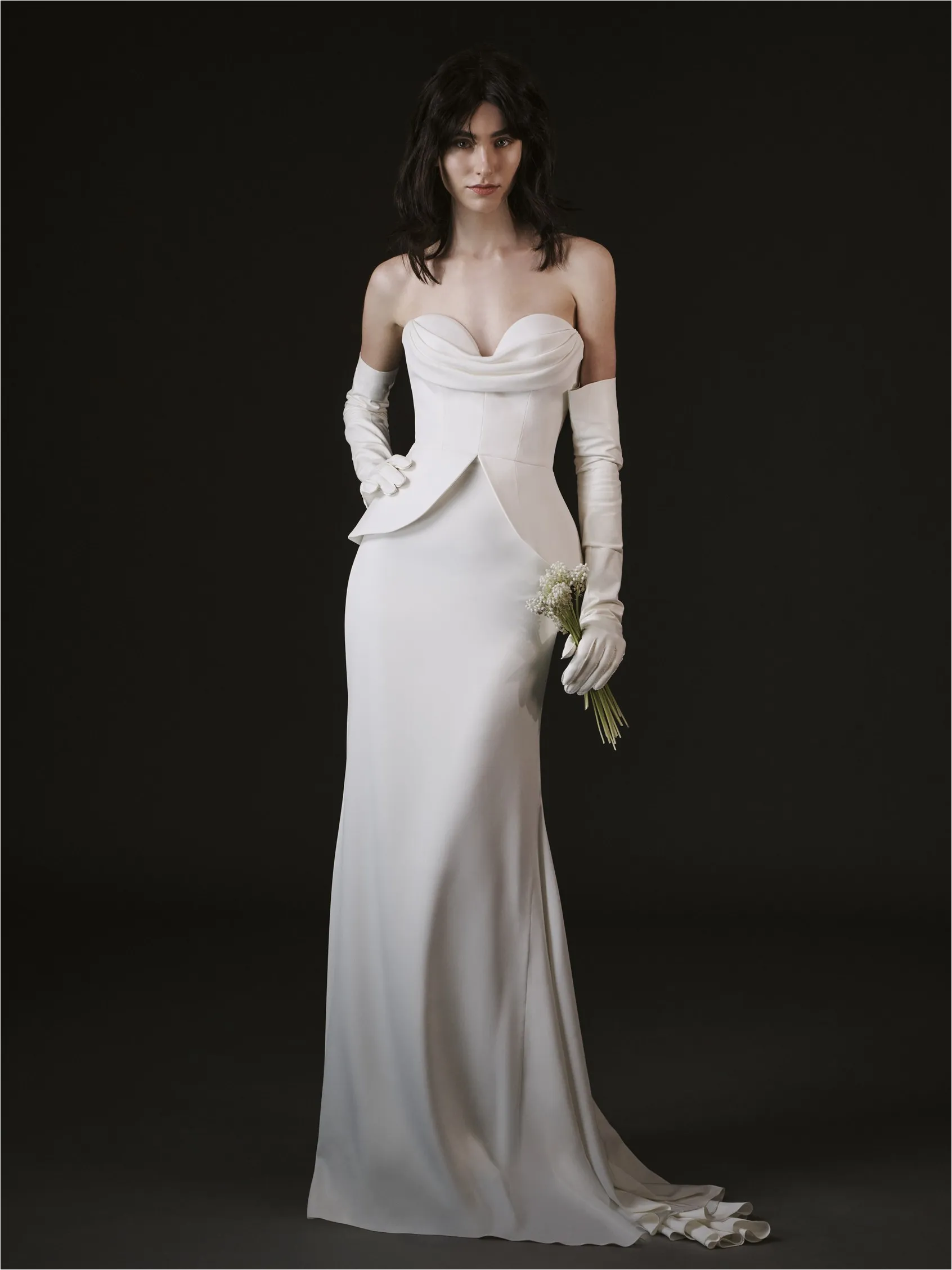 Vestido entallado con vuelo, peplum y escote corazón drapeado. Crepé y charmeuse se fusionan en una propuesta que equilibra sensualidad y sofisticación con un toque arquitectónico.