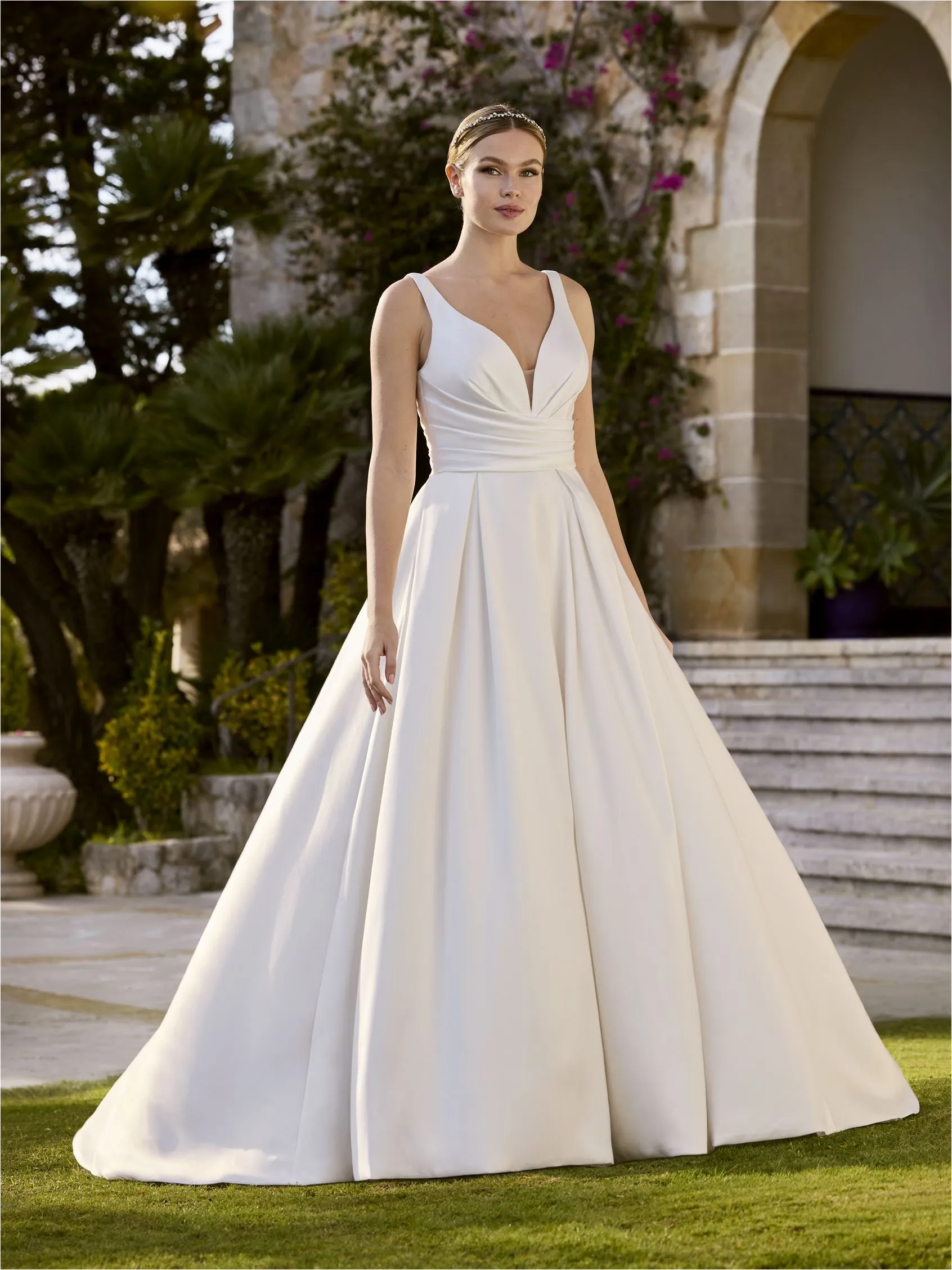 Sofisticado y moderno, este vestido de princesa tiene escote en V y espalda en V, confeccionado en organza de lujo, con capas de tul, encaje y cuentas para una silueta regia y refinada.