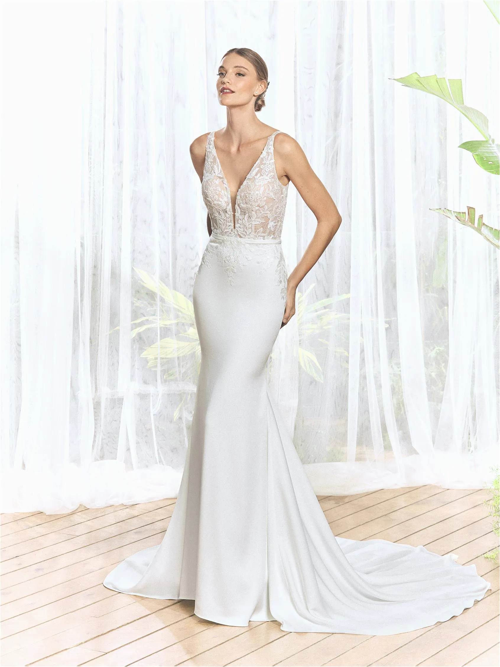 Diseñado para la novia segura de sí misma, este vestido sirena de crepé presenta un escote en V profundo y espalda abierta. Los acentos de encaje y tul suavizan su silueta estructurada, mientras que el bordado añade un toque de brillo.