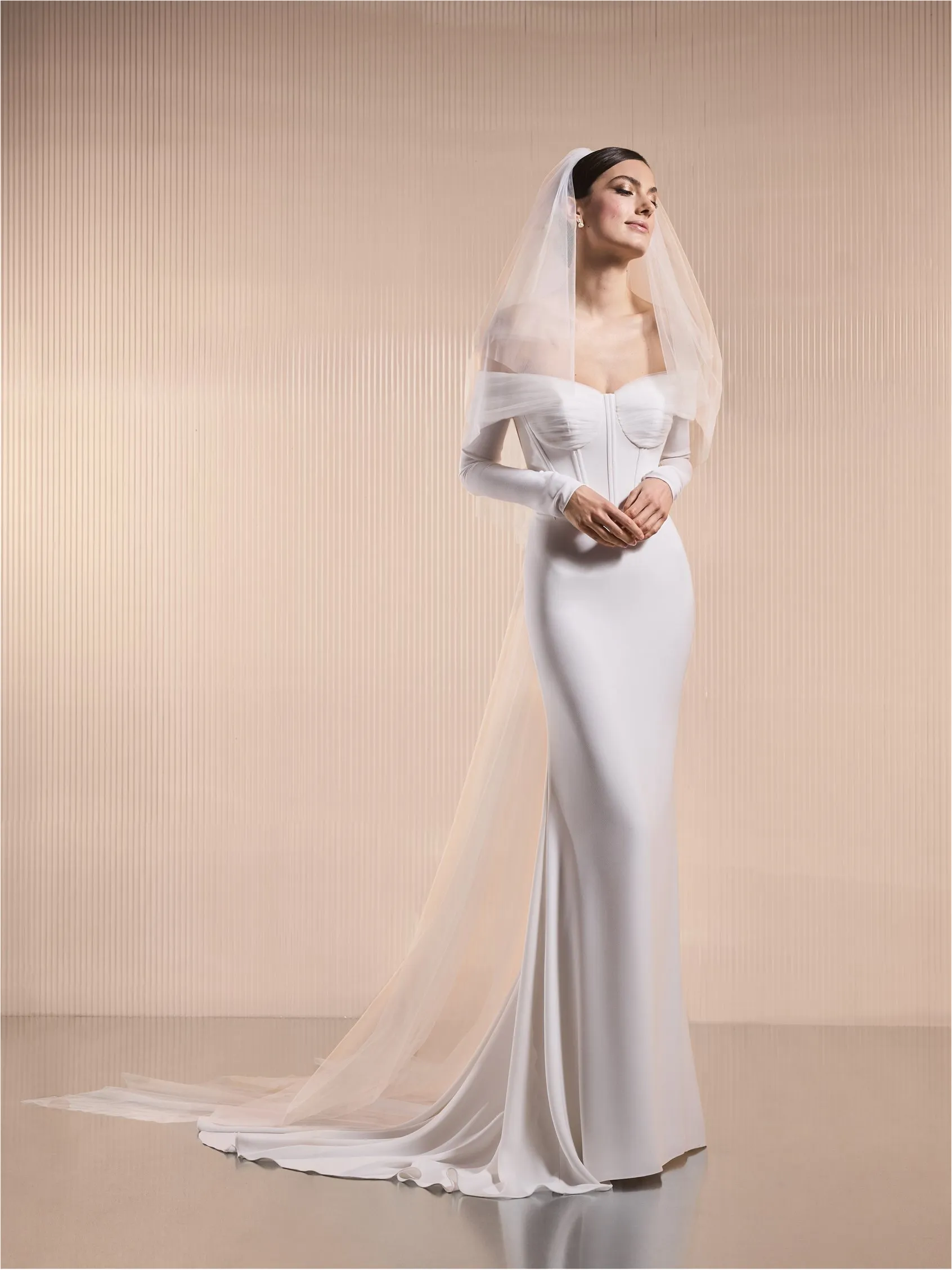 Una silueta estructurada con detalles sofisticados. Las costuras decorativas en las mangas largas y los hombros descubiertos aportan carácter a un diseño que se transforma con la cola desmontable de tul.