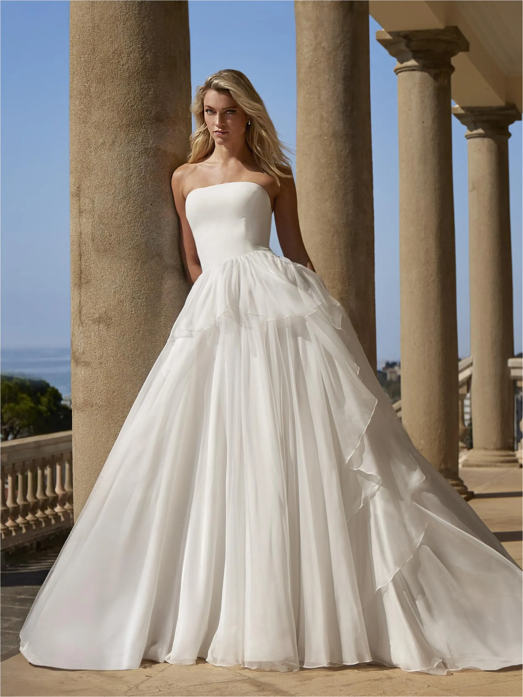 Con una silueta fluida de corte A y escote palabra de honor, este vestido se distingue por sus capas asimétricas en la falda que aportan dinamismo. La combinación de organza y crepé crea una caída ligera y elegante, ideal para una novia que busca un estilo natural y contemporáneo.