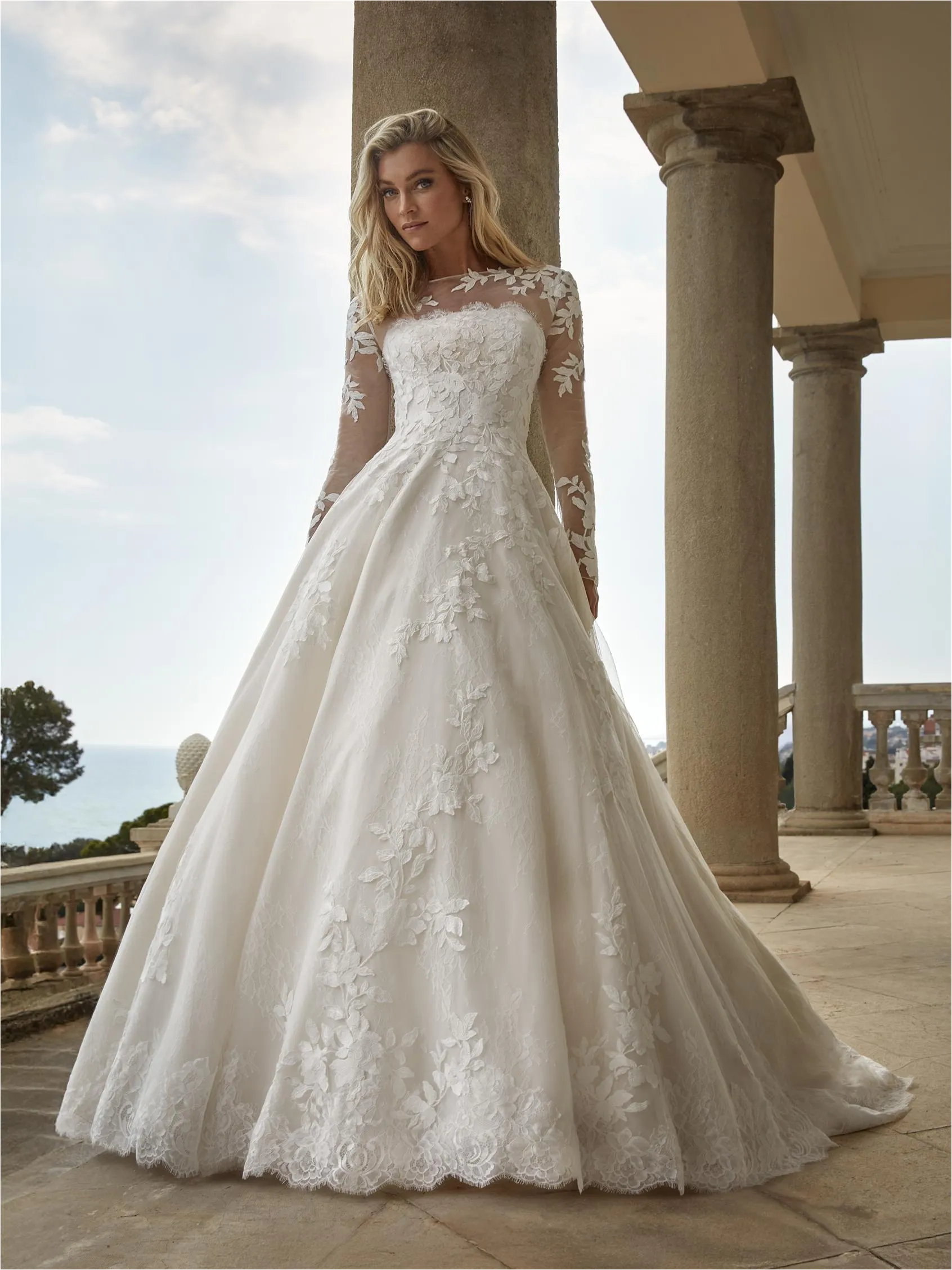 Este vestido de corte princesa con escote palabra de honor se transforma gracias a un top desmontable que permite jugar con el estilo. Los encajes florales y chantilly aportan romanticismo y versatilidad, creando una silueta clásica.