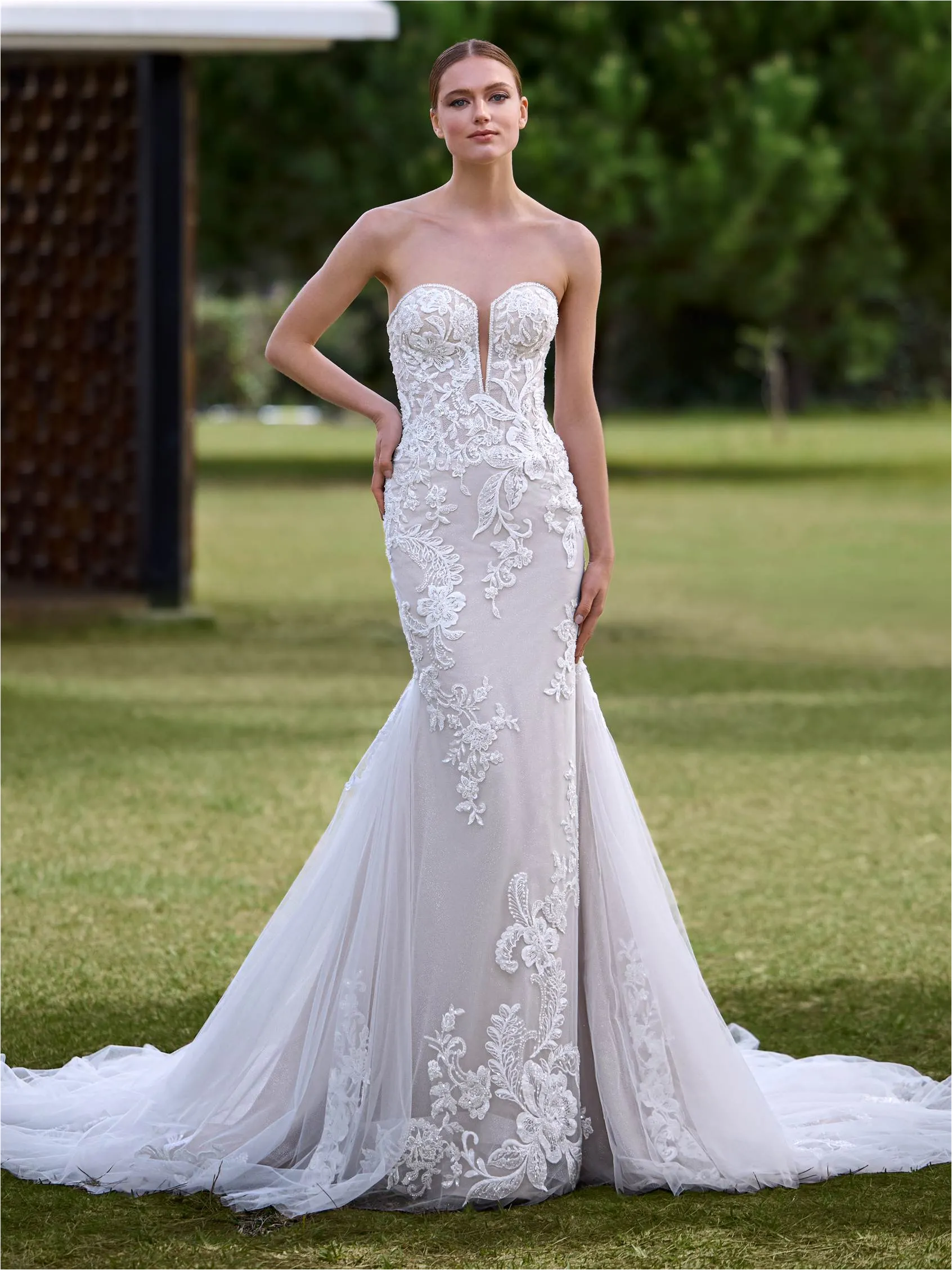 Este vestido de corte sirena con escote corazón envuelve la figura con una elegancia sensual. El encaje y el tul se enriquecen con pedrería que aporta destellos sutiles, creando una silueta envolvente y sofisticada. Una propuesta pensada para una novia que busca destacar con delicadeza y carácter.