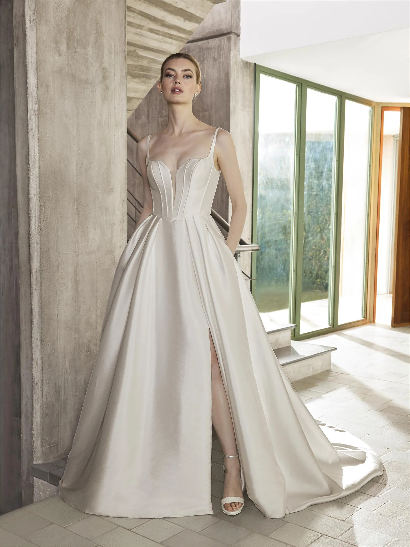 Vestido princesa con escote en corazón en mikado suave que crea un impacto dramático y sofisticado, perfecta para una celebración llena de elegancia.
