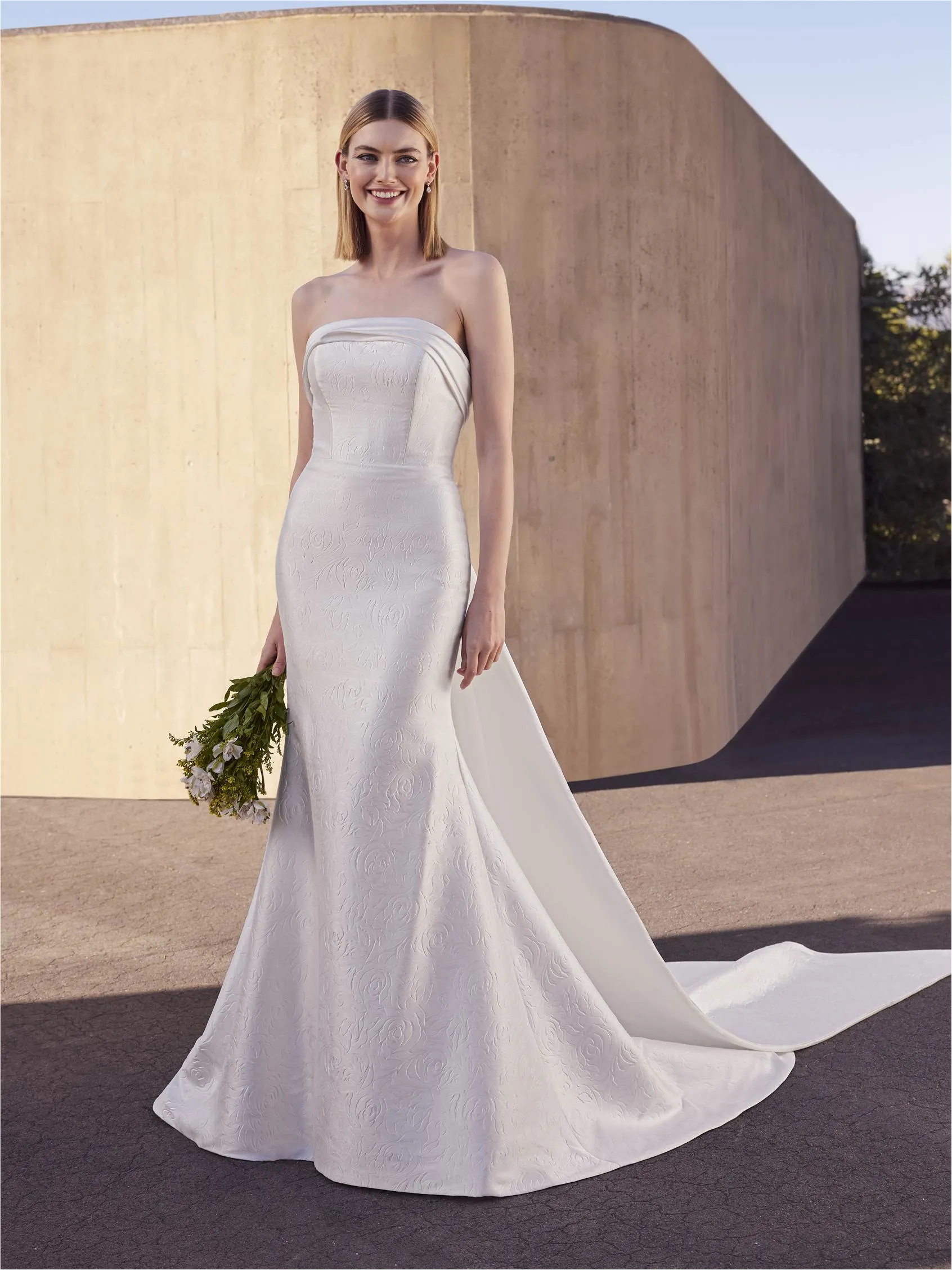 Un vestido sirena con escite palabra de honor, hecho de mikado, que expresa un minimalismo impresionante. La combinación de texturas suaves acentúa su elegancia minimalista, perfecta para una novia segura de su estilo.