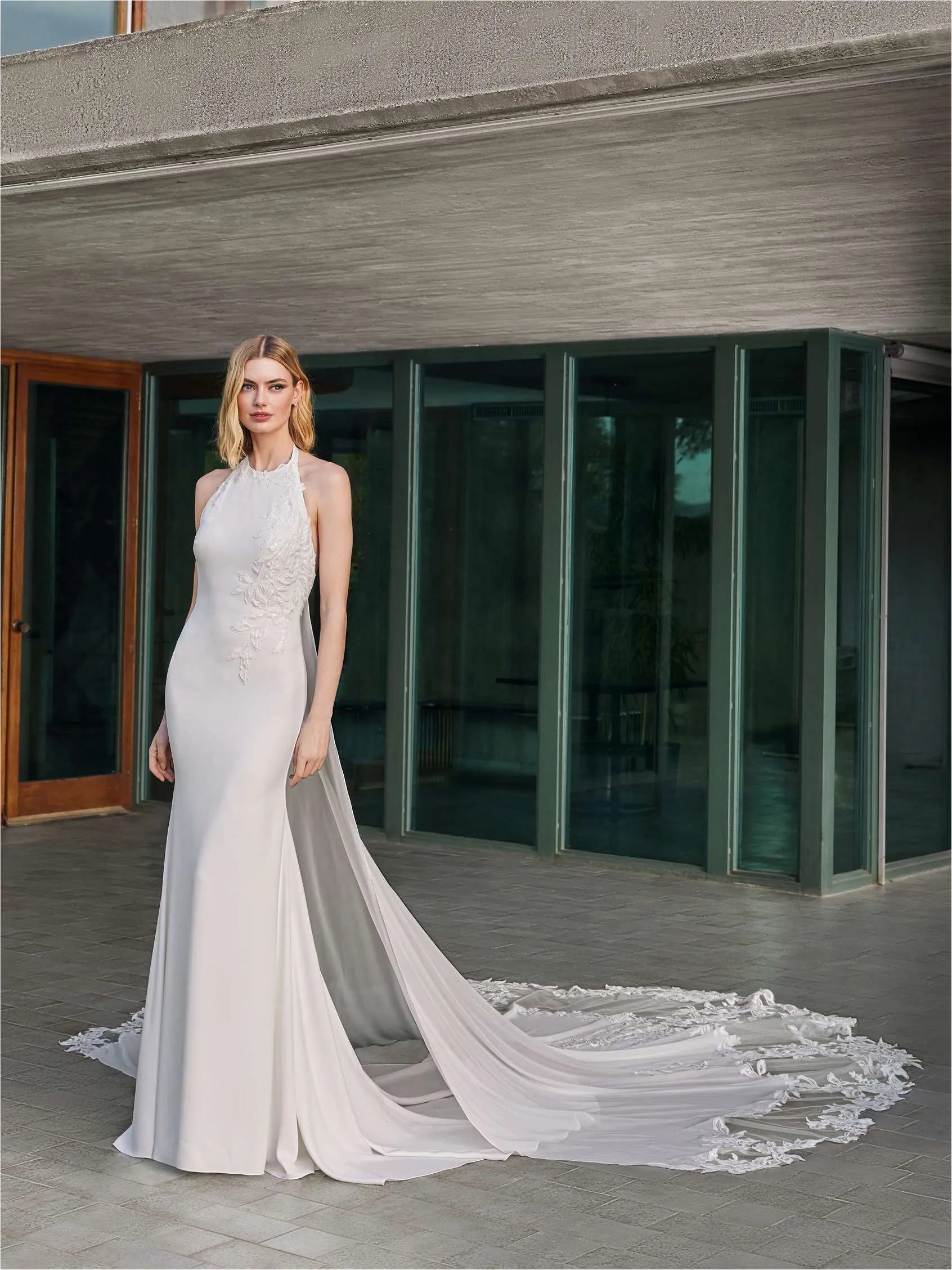 Vestido de corte sirena con escote halter, que continúa la tendencia de encajes glamorosos. Fabricada en crepé, encaje y perlas, brinda una estética romántica y llena de detalles elegantes.