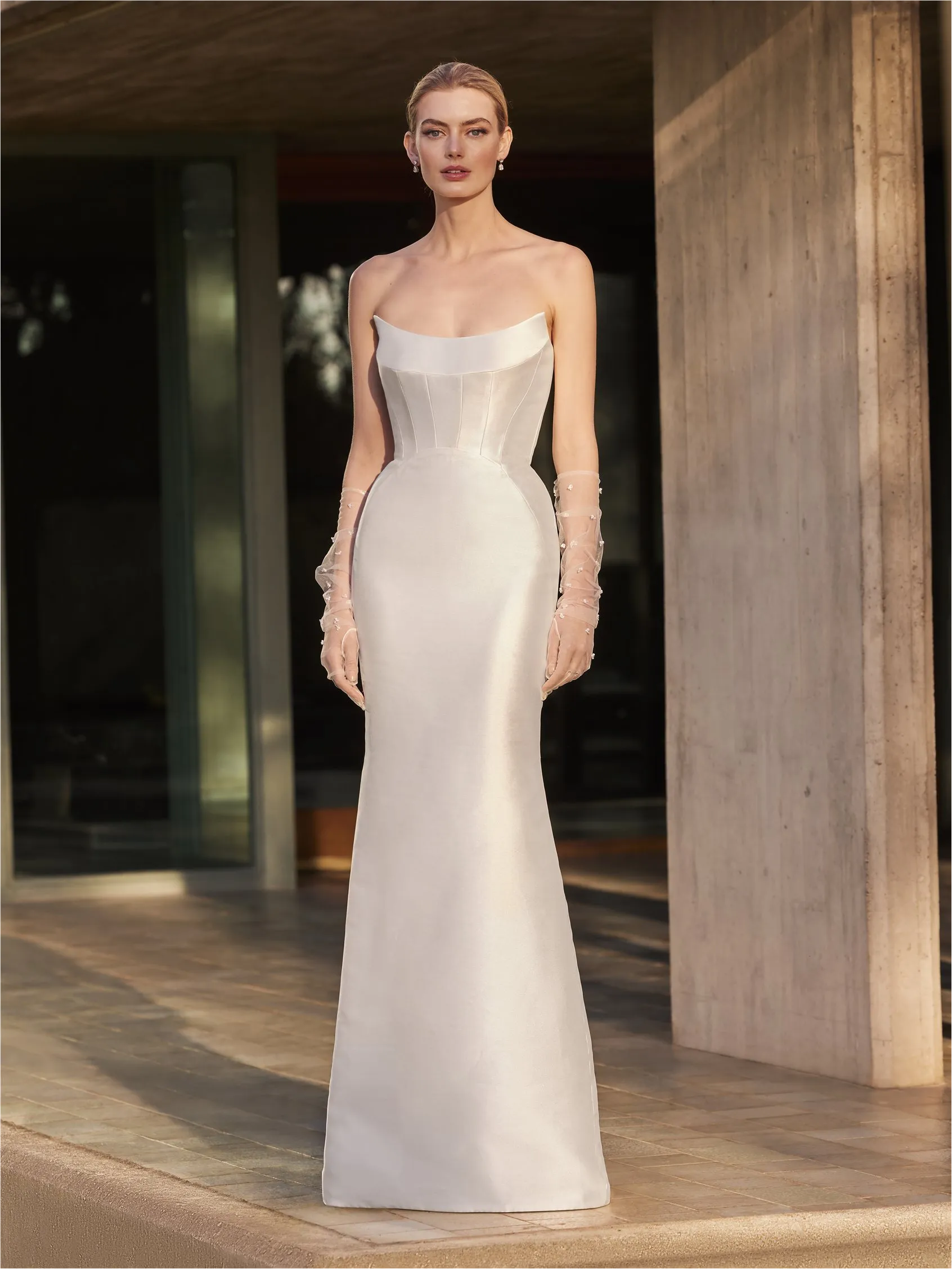 Un vestido sirena con escote palabra de honor inspirado en la belleza minimalista. Fabricado en mikado de alta calidad, su línea depurada y forma escultórica realzan la figura con estilo contemporáneo y refinado.