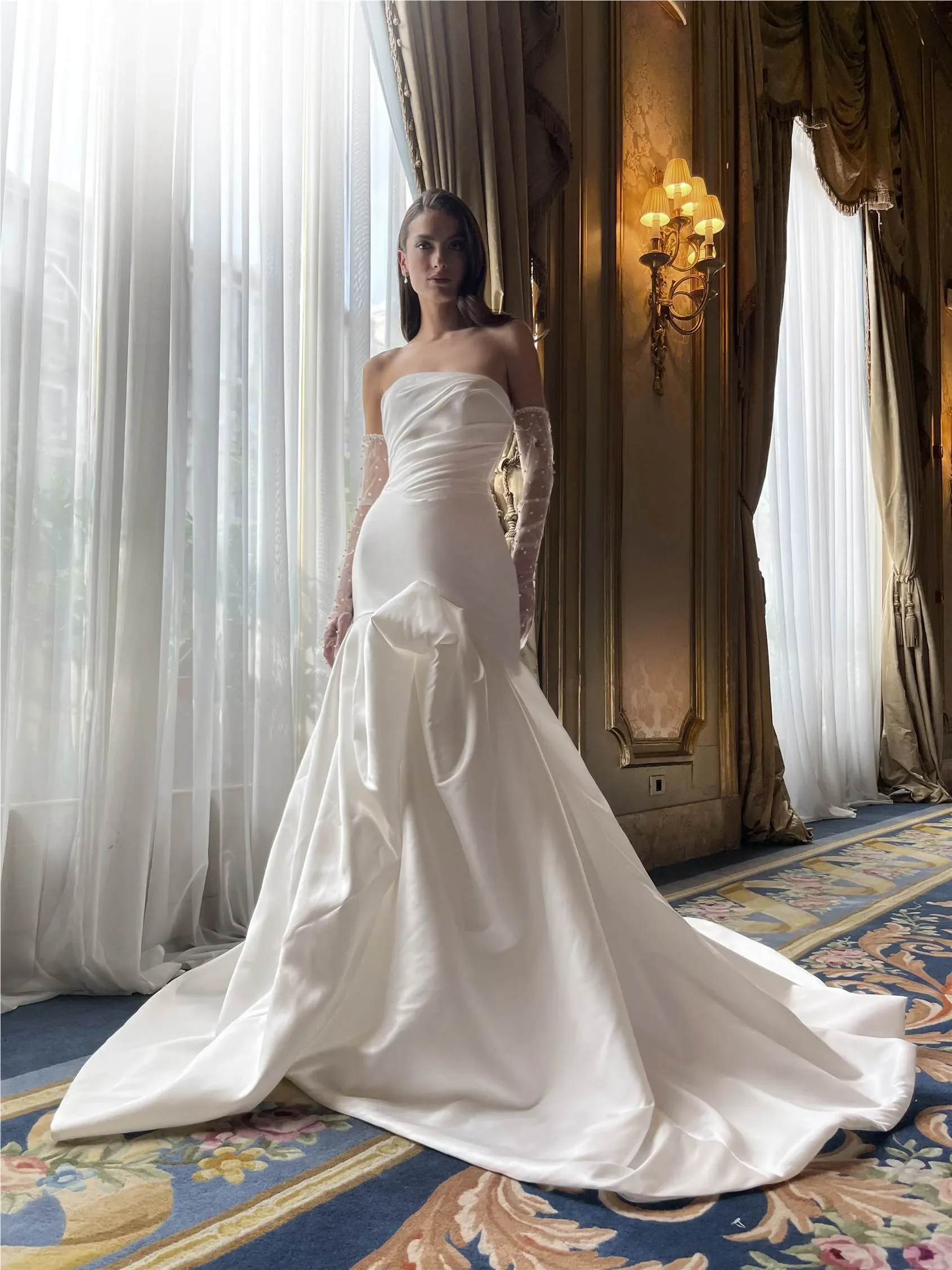 Minimalismo con carácter. El diseño entallado se realza con un drapeado sutil en el busto y en la falda, creando una silueta estructurada y fluida a la vez. Ideal para una novia que busca sofisticación.