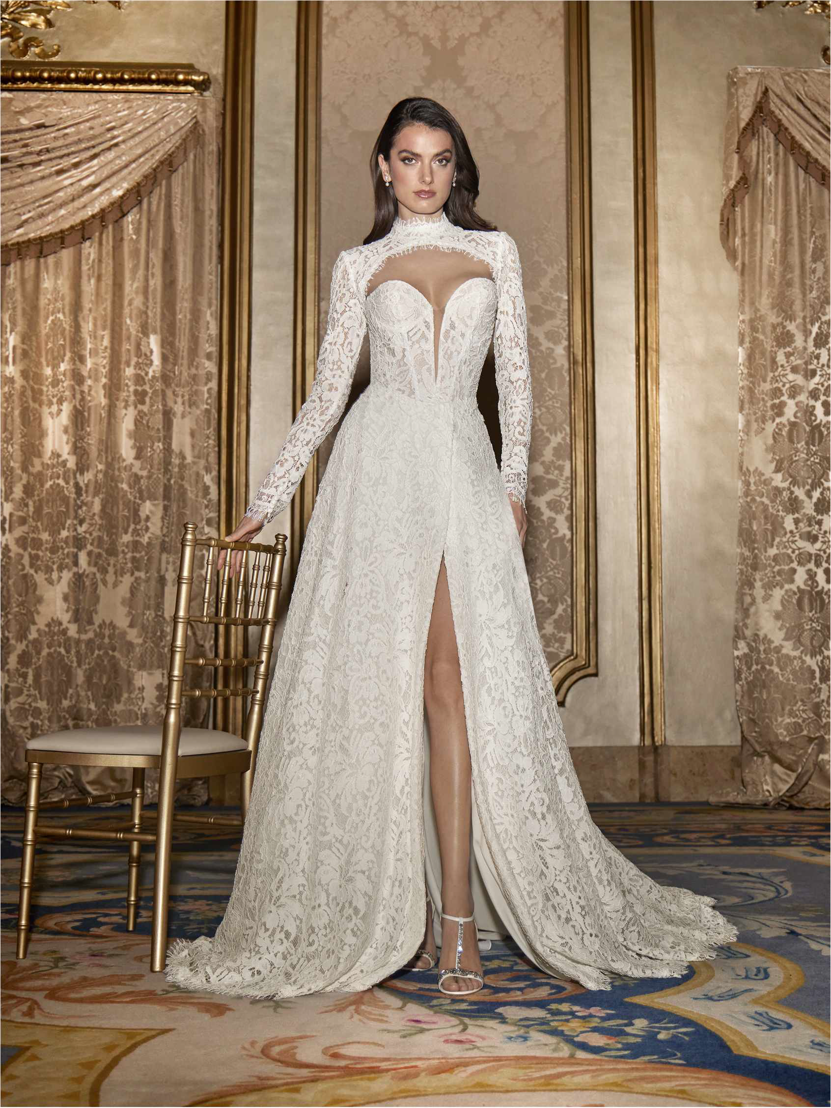 Una combinación sofisticada y versátil. El vestido palabra de honor con falda fluida y abertura lateral se combina con un bolero de cuello alto y espalda cerrada, creando un contraste entre sensualidad y discreción.