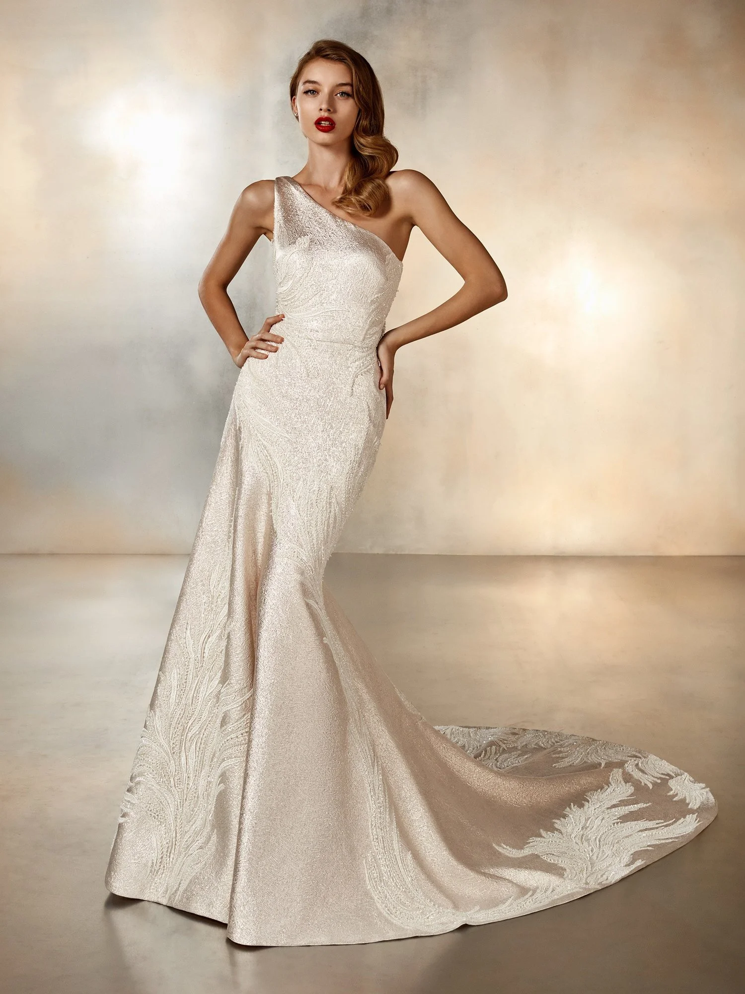 Vestido de un solo hombro con preciosos apliques en forma de plumas que fluyen por la impresionante espalda ilusión y opción de nuevo brocado dorado o crepé marfil.