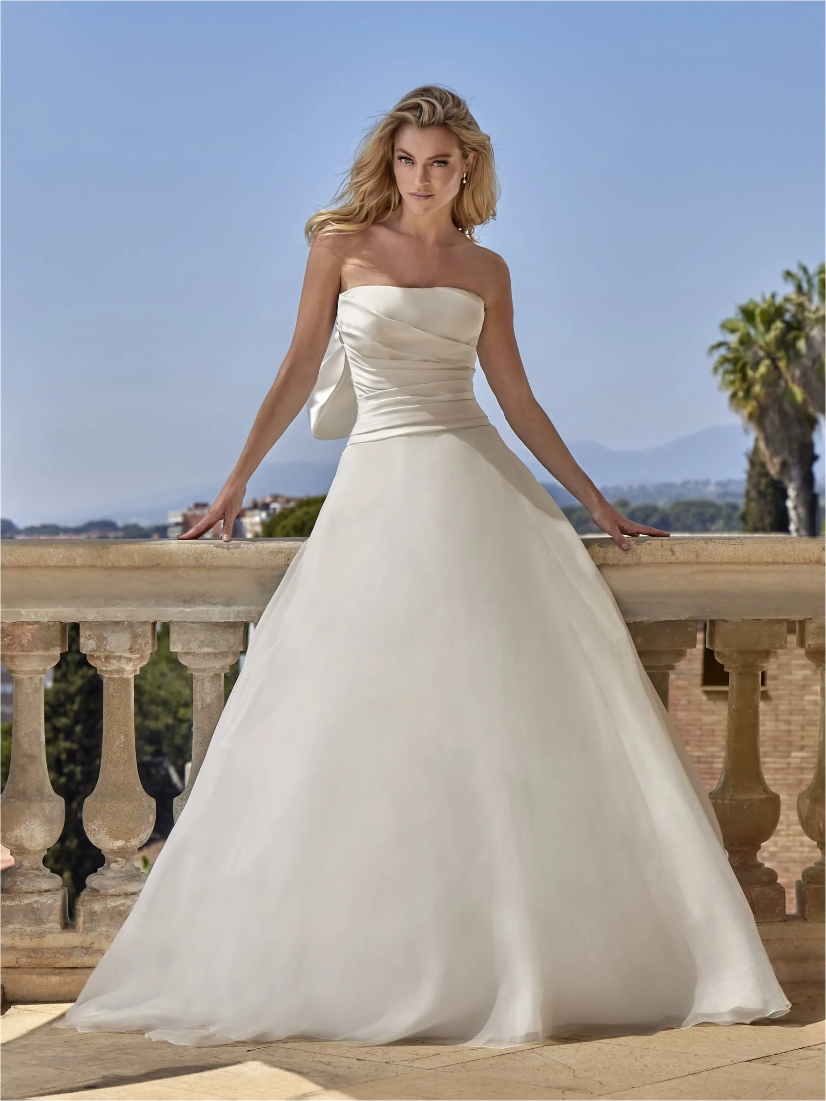 Este vestido de corte A con escote palabra de honor se transforma gracias a una cola desmontable con un gran lazo que le aporta dramatismo. La organza y el suave mikado se combinan en una silueta estructurada y ligera, diseñada para una novia que busca la elegancia.