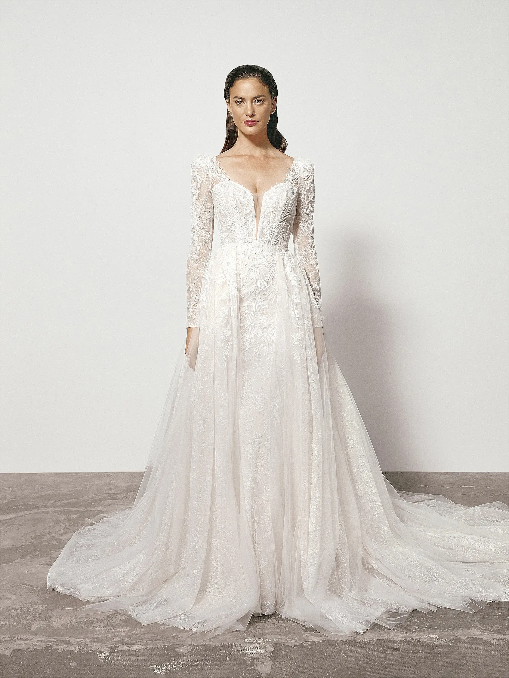 Conoce nuestro vestido de novia sirena con manga larga y escote corazón Fiora, un diseño donde se unen romanticismo y elegancia.