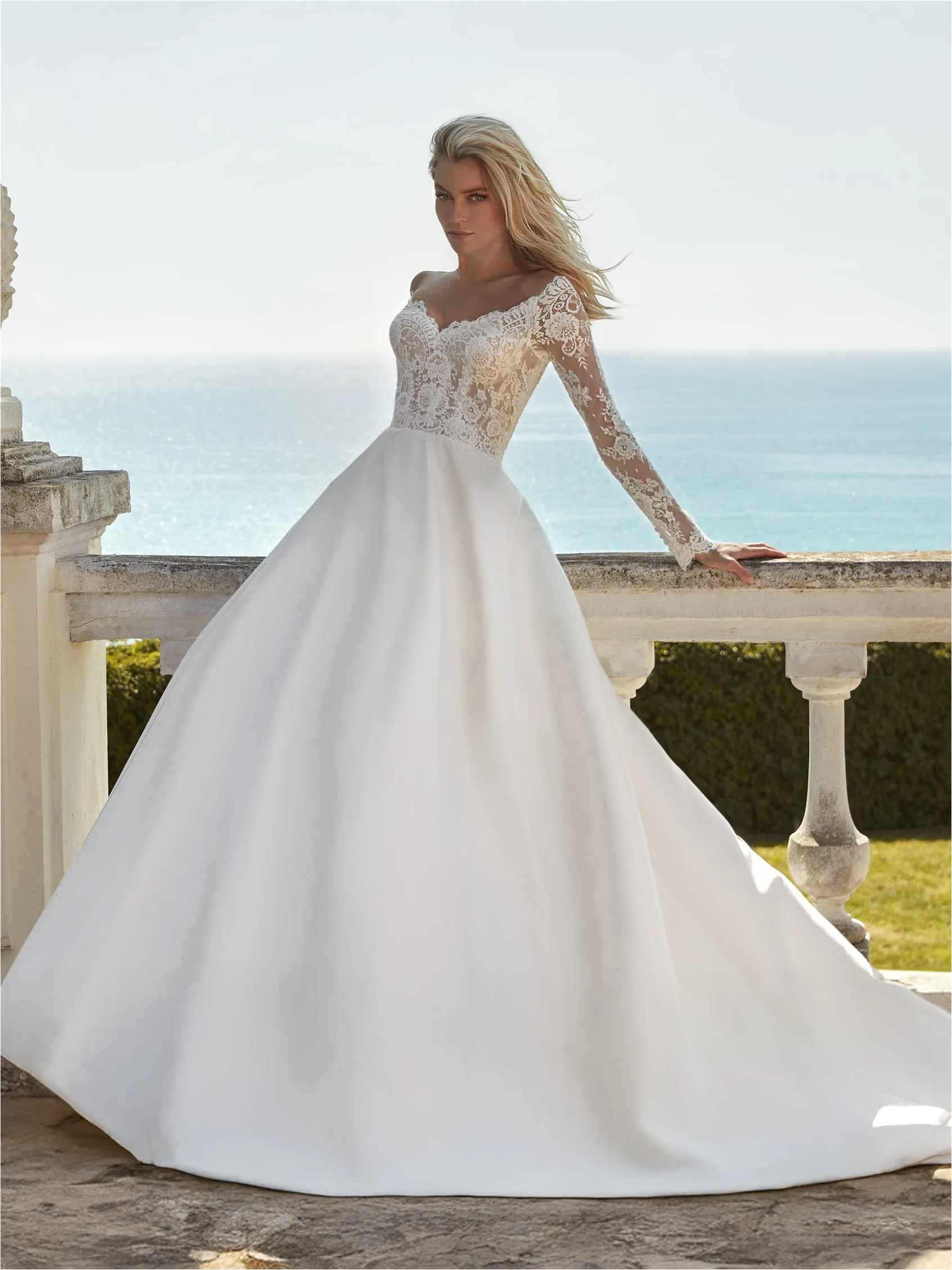 Este vestido de corte A con mangas largas y escote tipo “off-the-shoulders” combina estructura y delicadeza en una silueta envolvente. El cuerpo semitransparente con encaje aporta un aire sensual y refinado, mientras el mikado y el chantilly se funden en una propuesta que equilibra dramatismo y elegancia.