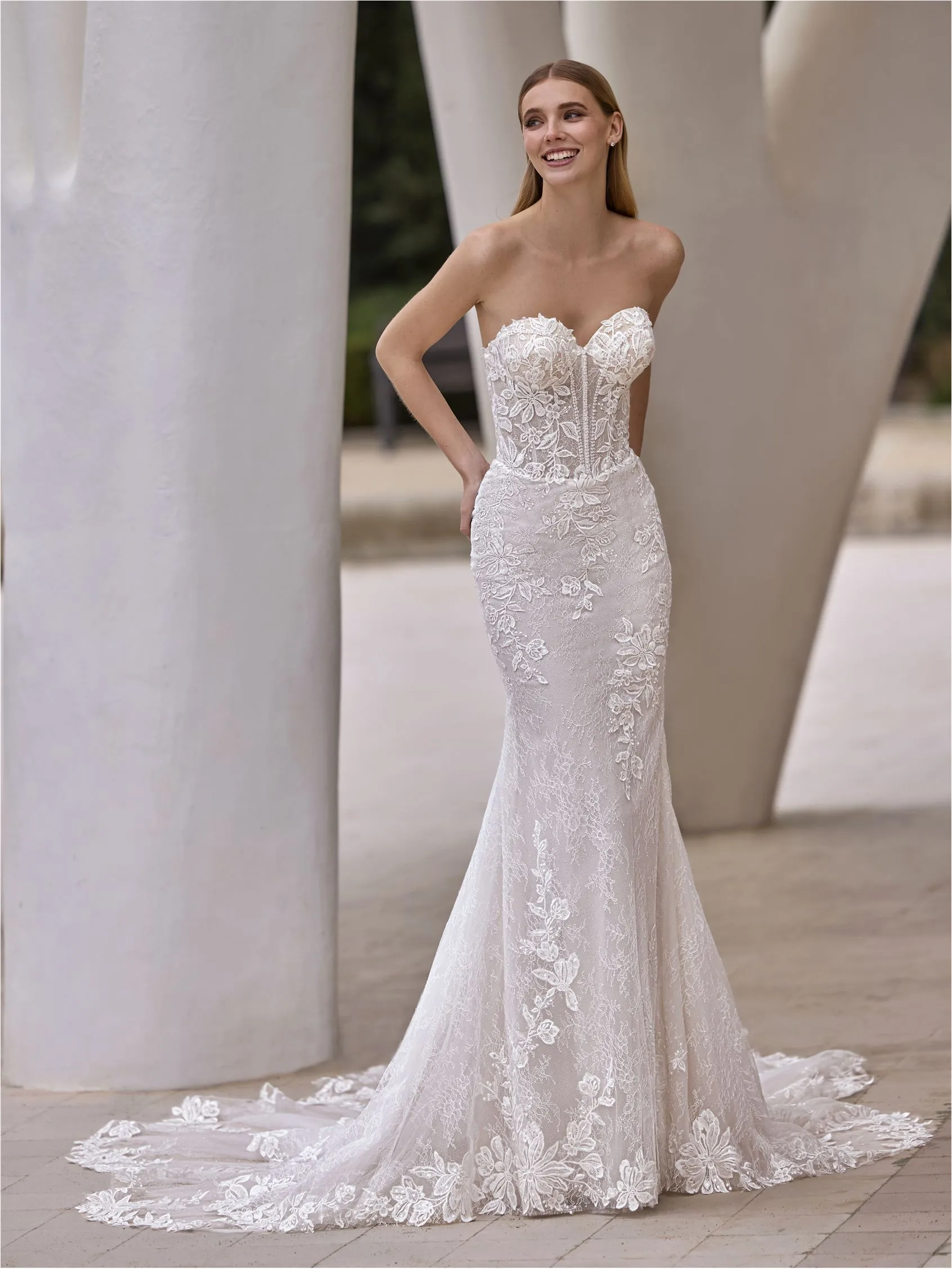 Este vestido de corte sirena con escote corazón se adorna con motivos florales de encaje y chantilly. Las cuentas aportan un brillo discreto, creando una silueta femenina y sofisticada que destaca por su delicadeza.